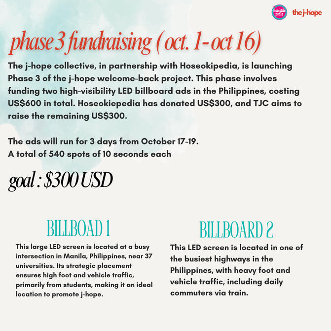 UPDATE ON PHASE 2 - IT IS NOW CLOSED! Thank you so much for your kind donations and the donors who offered a funding match and we were able to hit our target!WE HOPE YOU CAN SHARE AND CONTINUE SUPPORT THE PHASE 3 OF OUR j-hope WELCOME BACK PROJECTS!